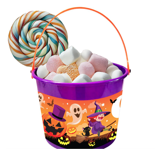 Plastikust ämber Halloweeni piltidega.