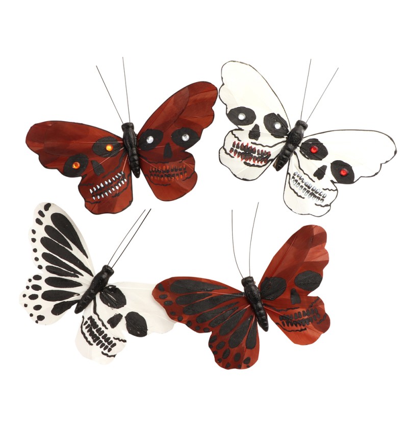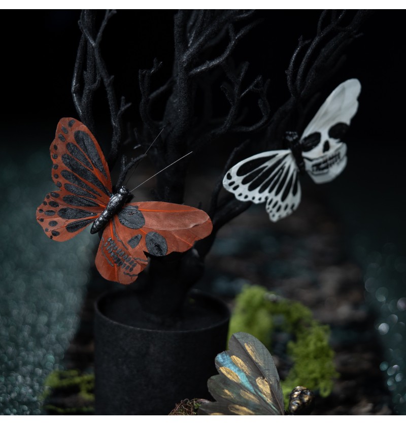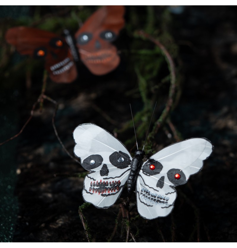 Dekoratsioonid klambritega „Koljulised liblikad“ – musta, valge ja punase värvi kombinatsioon koljumotiividega näeb eriti muljetavaldav välja ja köidab tähelepanu.