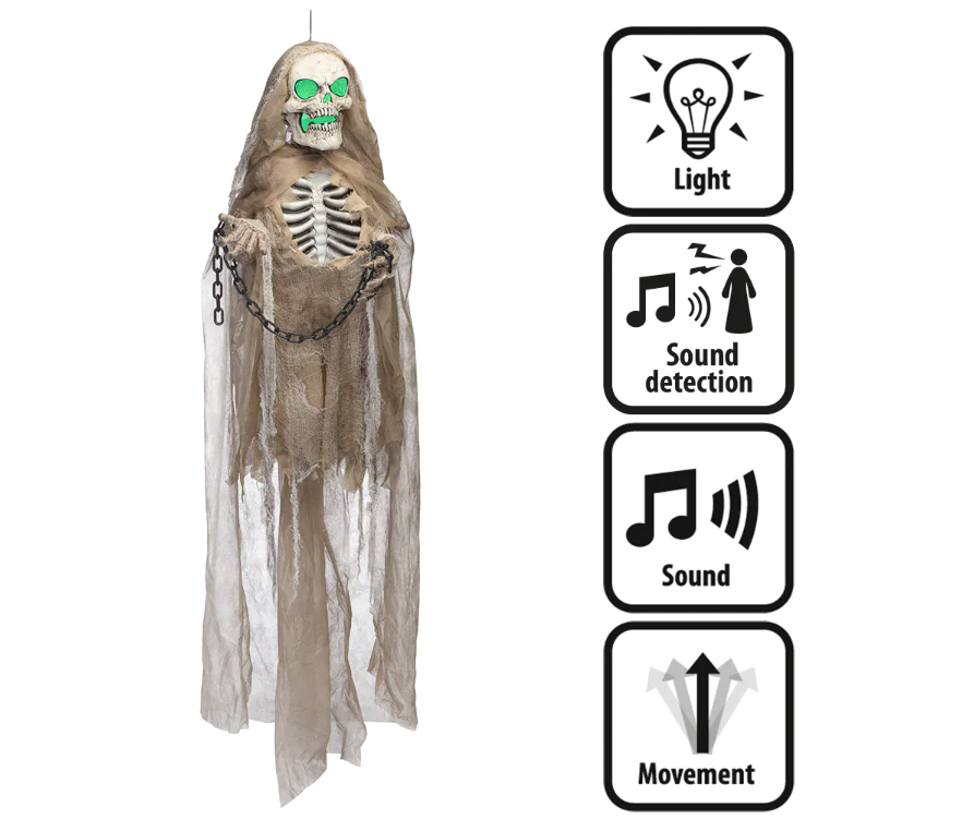 Dekoratsioon on riputatav. Lülitades sisse hakkab skelett liikuma ja tekitama õudseid helisid. Silmad ja suu helendavad roheliselt.