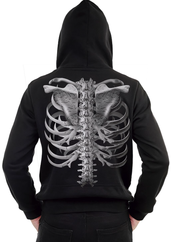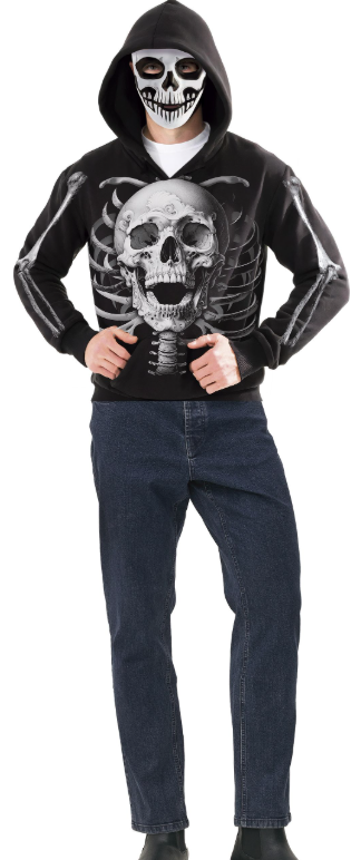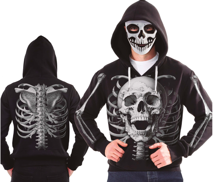 Dressipluus „Kolju“ – must kapuutsi ja maskiga, kaunistatud realistliku kolju ja luustiku trükiga esiküljel, seljal ning varrukatel.