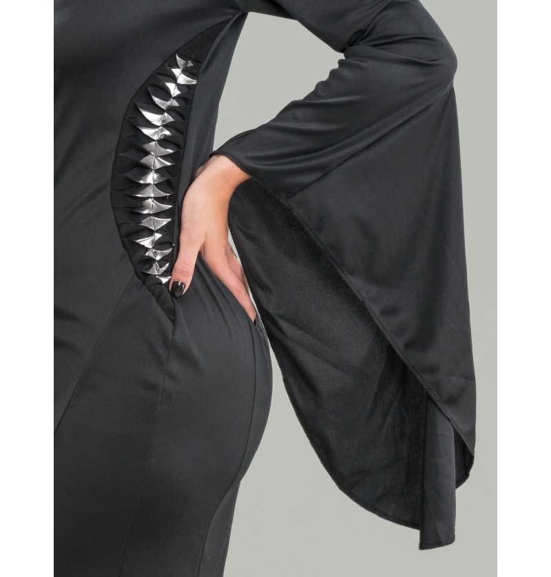 Morticia kostüüm - must kleit, millel on laiad varrukad ja läikiv detail vöö kohal.