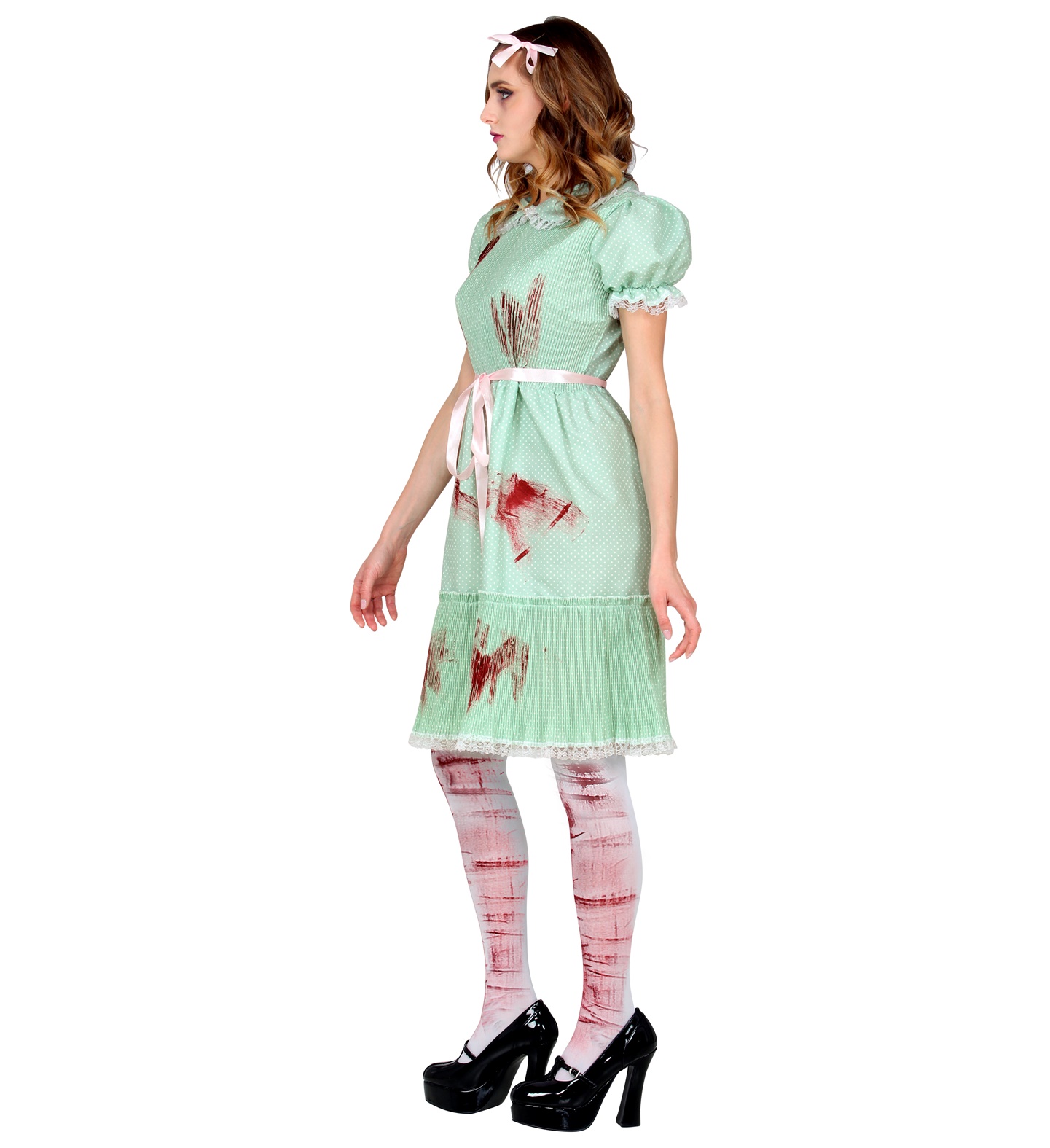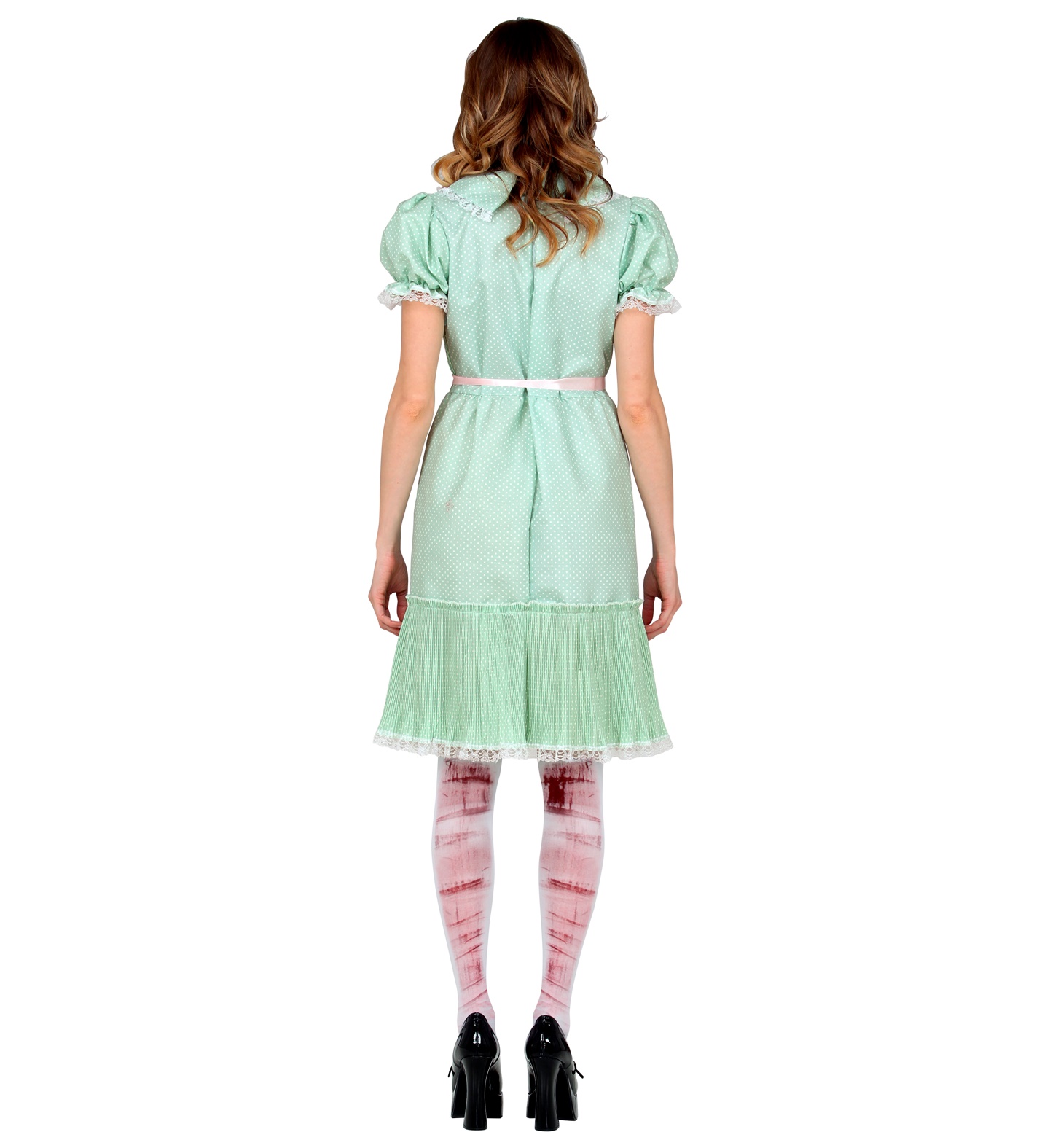 Kostüüm Tapja Nukk koosneb rohelisest kleidist puhvis varrukatega ja õrnade pitsiliste detailidega. Kleit on kaunistatud „veriste“ punaste jälgedega, mis lisavad hirmutavat meeleolu. Roosa vöö rõhutab taljet ja loob kontrasti kostüümi süngele stiilile. Komplekti täiendavad valged põlvikud punaste „veretriipudega“, mis sobivad ideaalselt nuku välimusega.