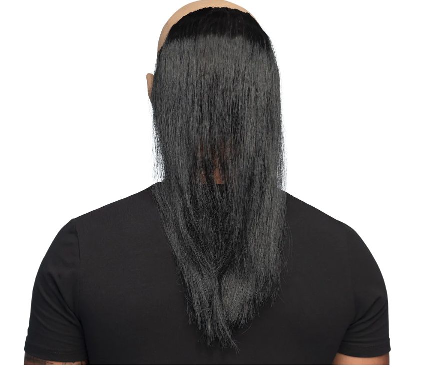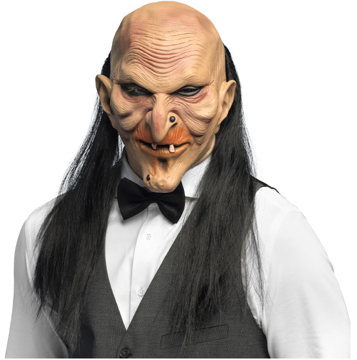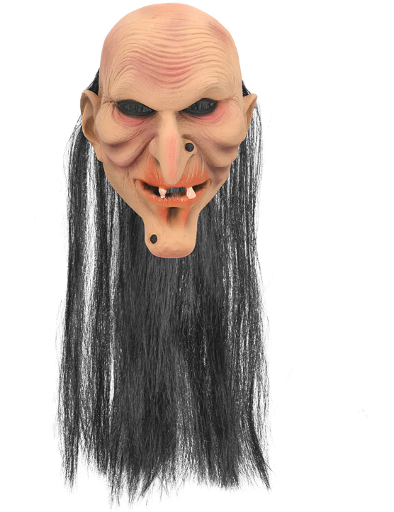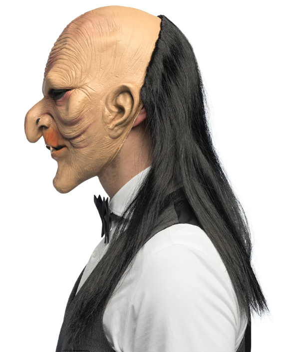 Lateksmask "Hirmuäratav teener" on kaunistatud pikkade mustade juuste, kortsulise näo, pika nina ja viltuste hammastega.