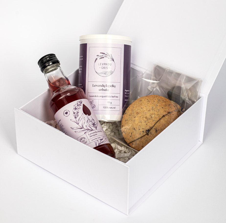 Lavendlivõrsete siirup, lavendlimaitsega käsitsi valmistatud küpsised ja lavendlilehtede tee. Kogu komplekt on pakitud luksuslikku valgesse magnetkaanega karpi.