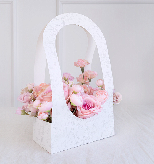 Dekoratiivne korv lillede jaoks. Korv on valmistatud valgest paberist, millel on pärlmutterjas, läikiv lehtede ja lilledega oksaprint.