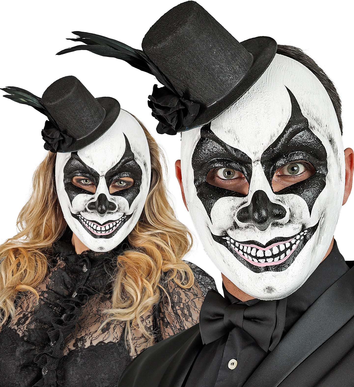 Mask koos kübaraga – plastmassist mask mustvalgetes toonides, laia naeratusega, kaunistatud musta kübaraga.