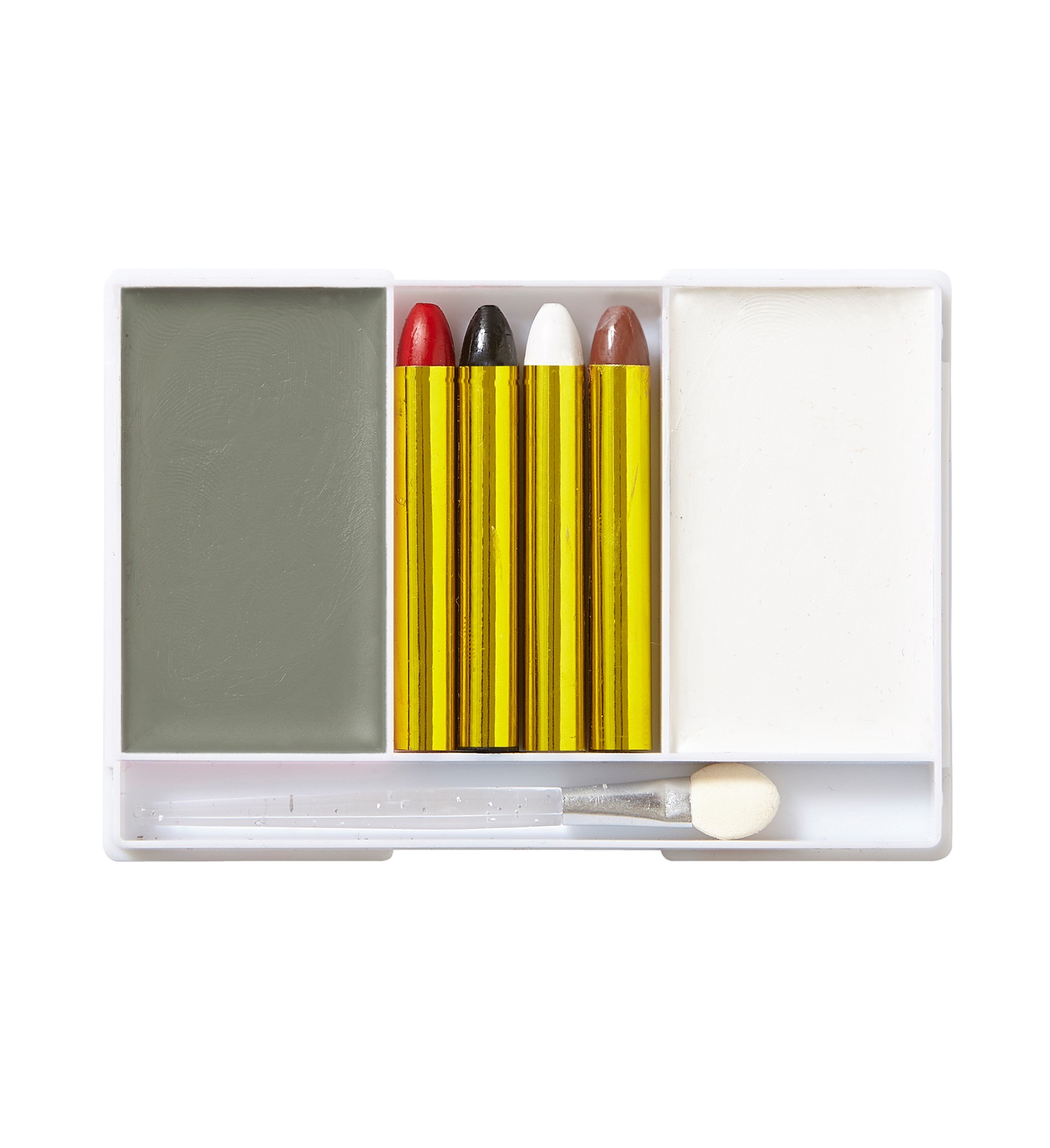 Komplekti kuuluvad kvaliteetsed, pehmed ja mitmevärvilised meigi värvipliiatsid neljas toonis, halli ja valget värvi meigipaletti ja pintslit