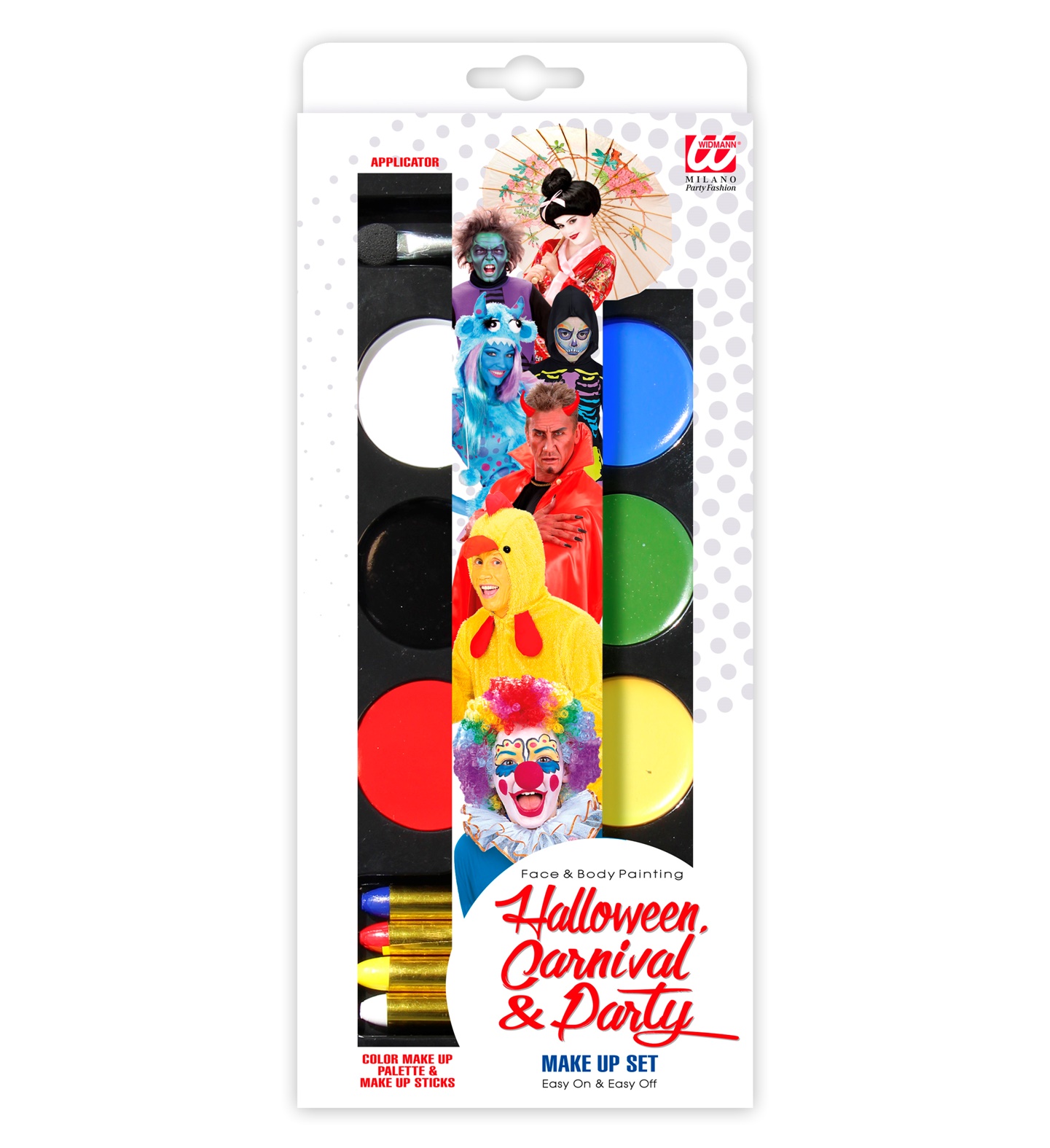 Toonid: valge, sinine, must, roheline, punane ja kollane. Meigipliiatsite värvid: valge, kollane, sinine ja punane.