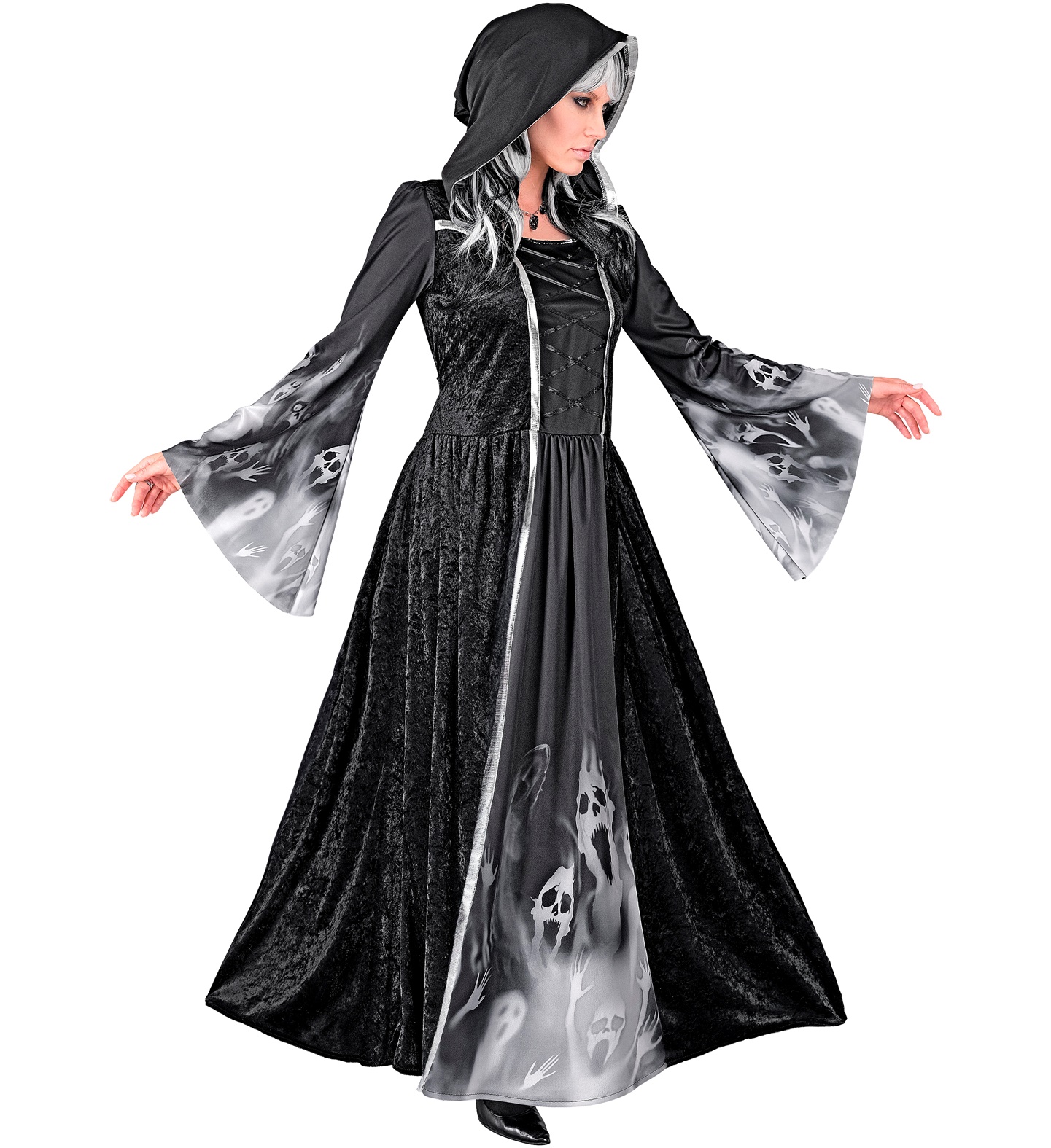 Pikk must kleit kapuutsiga ja laiade varrukatega, salapäraste hallide ornamentidega, mis meenutavad pimedusest tõusnud karjuvate vaimude nägusid, loob õudust tekitava, kuid samas elegantse välimuse. Ees olev korseti-tüüpi pael lisab kleidi siluetile graatsilisust, tihedalt istuv ülakeha kontrastib laia, maapinnani ulatuva alaosaga.