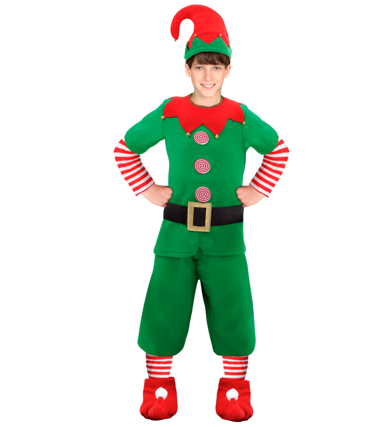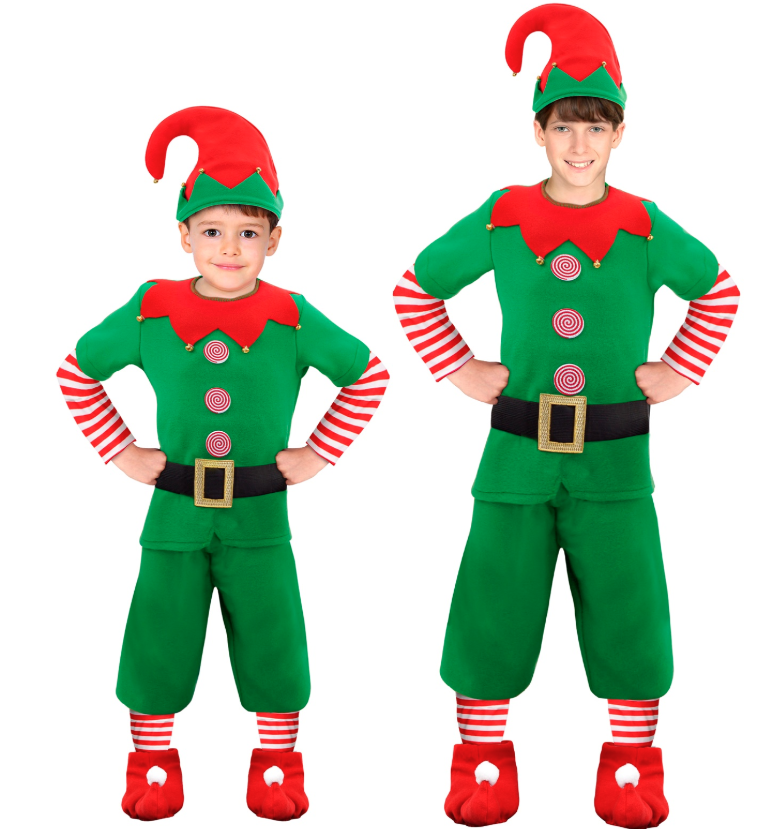 Laste päkapiku kostüüm on valmistatud meeldivast materjalist, pikkade varrukatega särk; rohelised elastse kummiga püksid; punased säärised; kuldsete kellukestega kaunistatud müts; must vöö kuldse pandlaga.