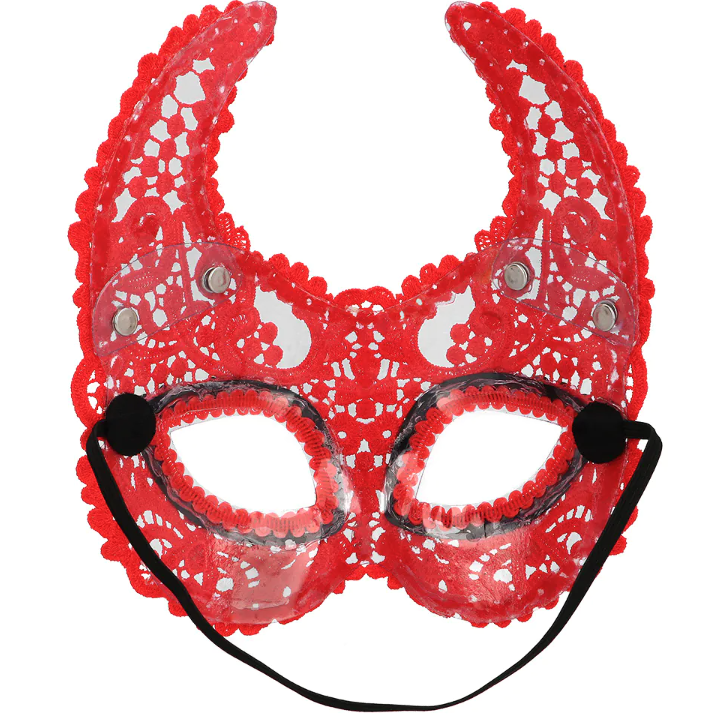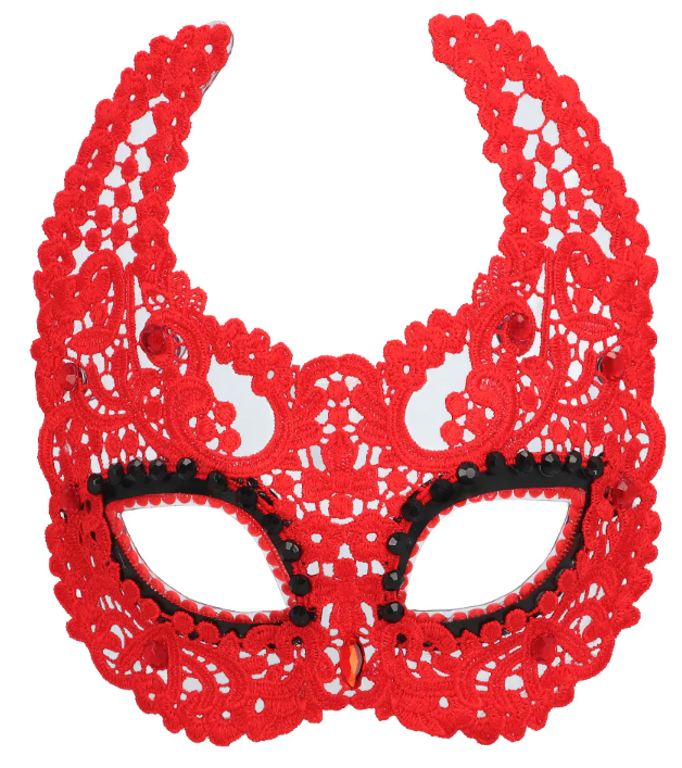 Pitsiline punast värvi silmamask, kaunistatud mustade kivikestega. Seotakse kinni musta paelaga.