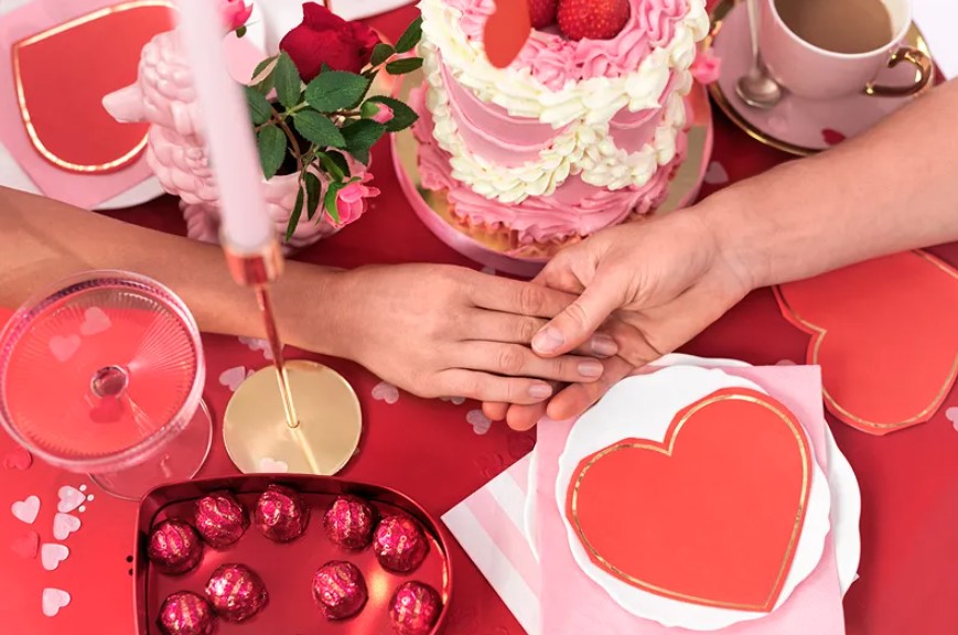 Punased, südamekujulised salvrätikud kuldsete detailidega on stiilne valik sõbrapäeva peoks.