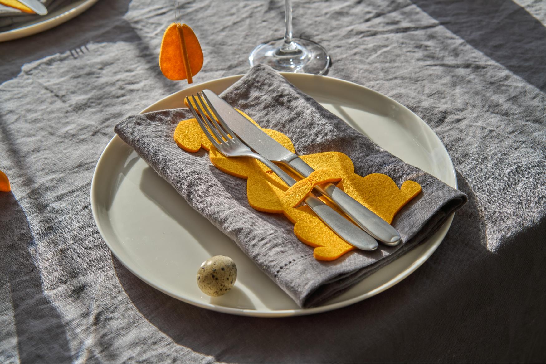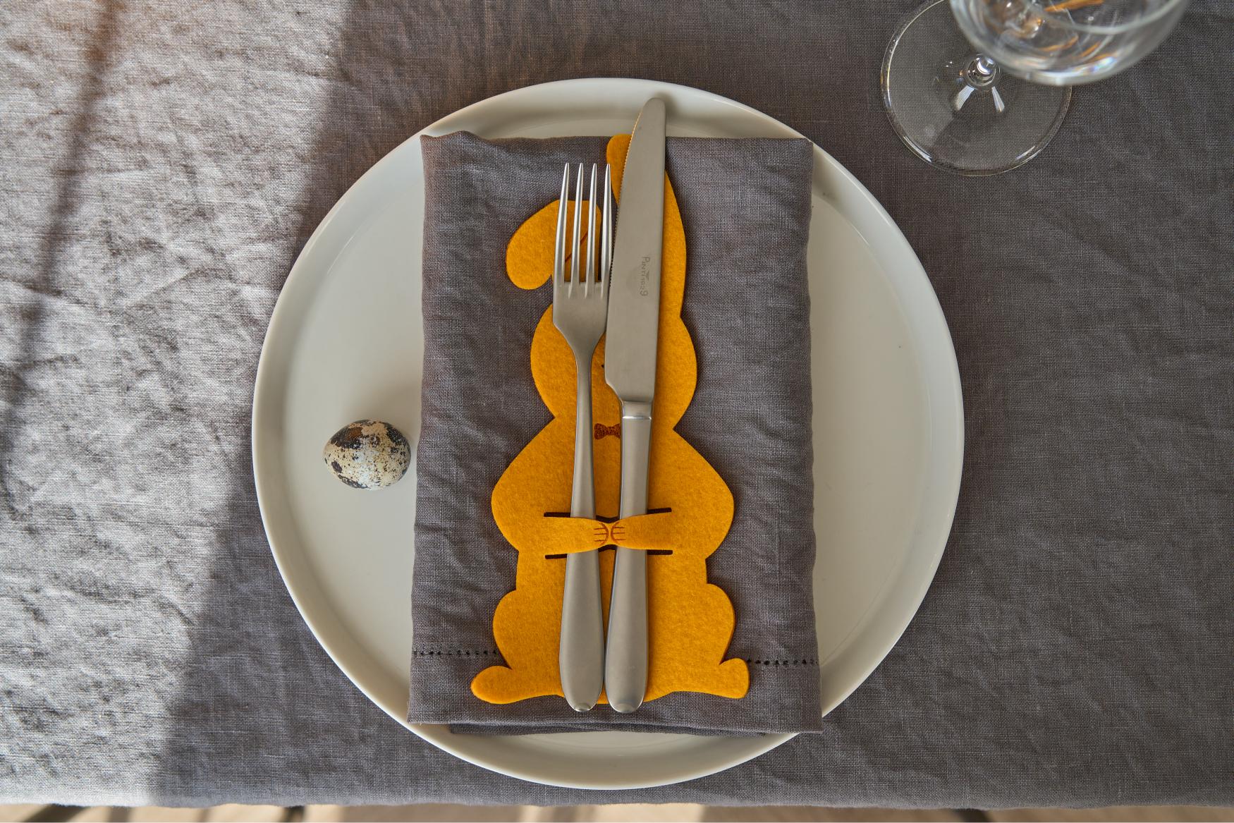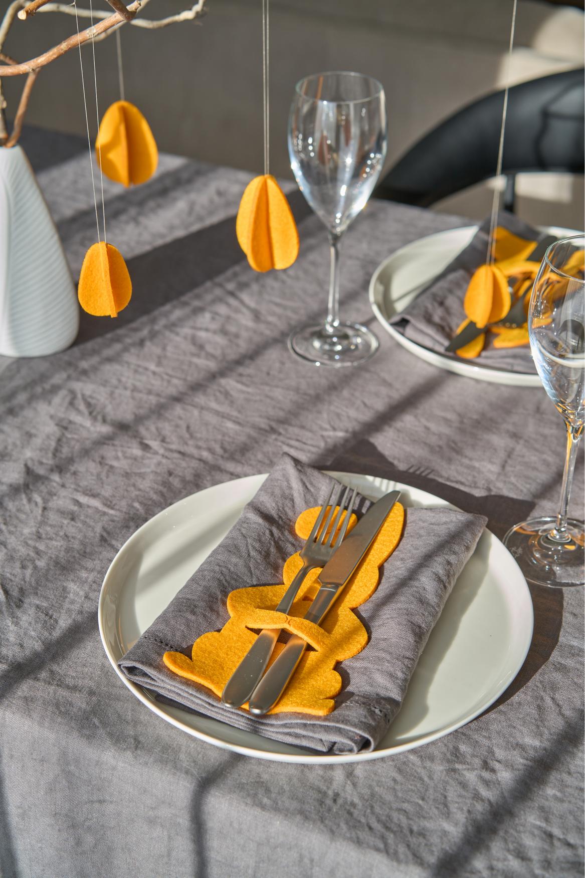 Lihavõttelauda kaunistades kasutatavad „Jänku“ söögiriistade hoidjad on suurepärane piduliku laua aksessuaar, mis lisab mängulisust ja värskust. Sobitage kollased vildist söögiriistade hoidjad sama värvi salvrätihoidjatega ning kaunistage laud värvitud munade ja kevadiste lilledega, luues ühtse lihavõttelauda dekoratsiooni.