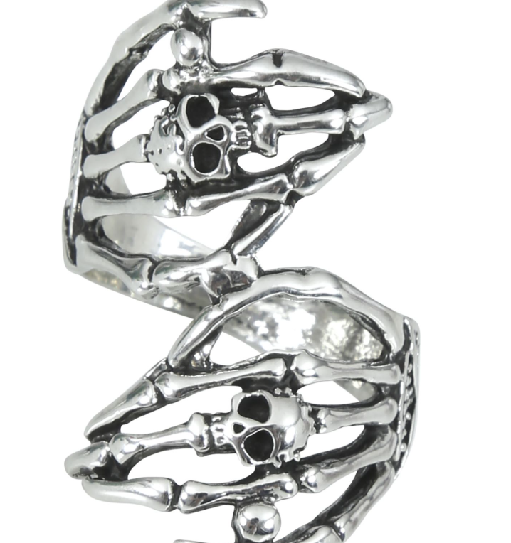 Metallist sõrmus luukere kätega, mis on kaunistatud koljudega.