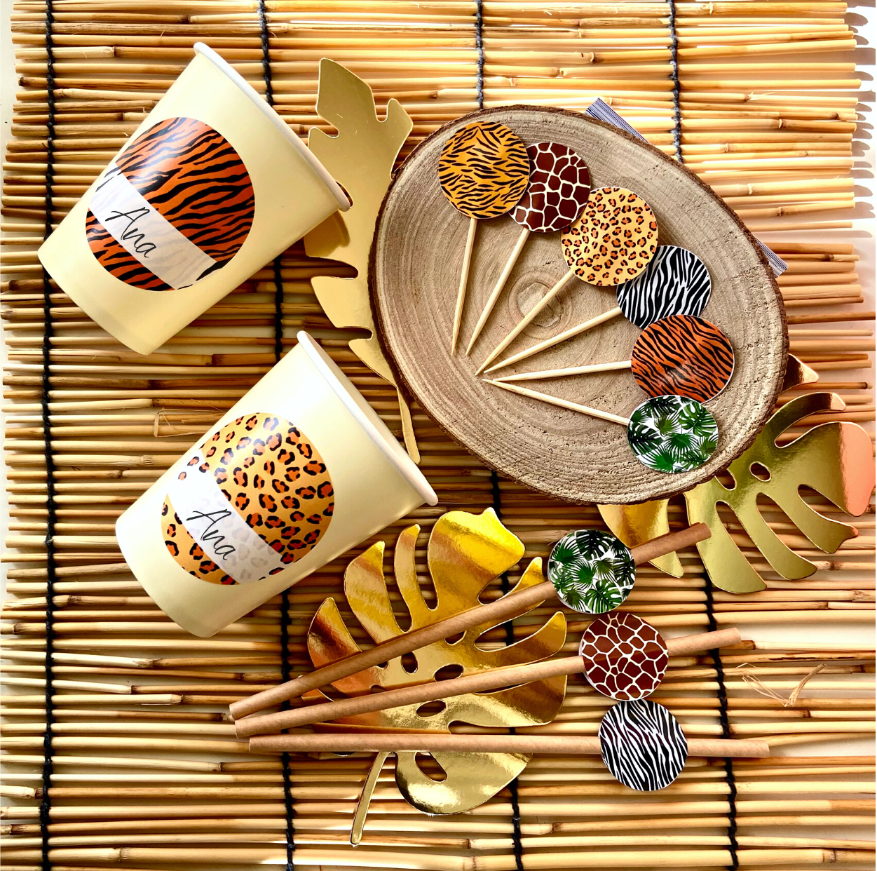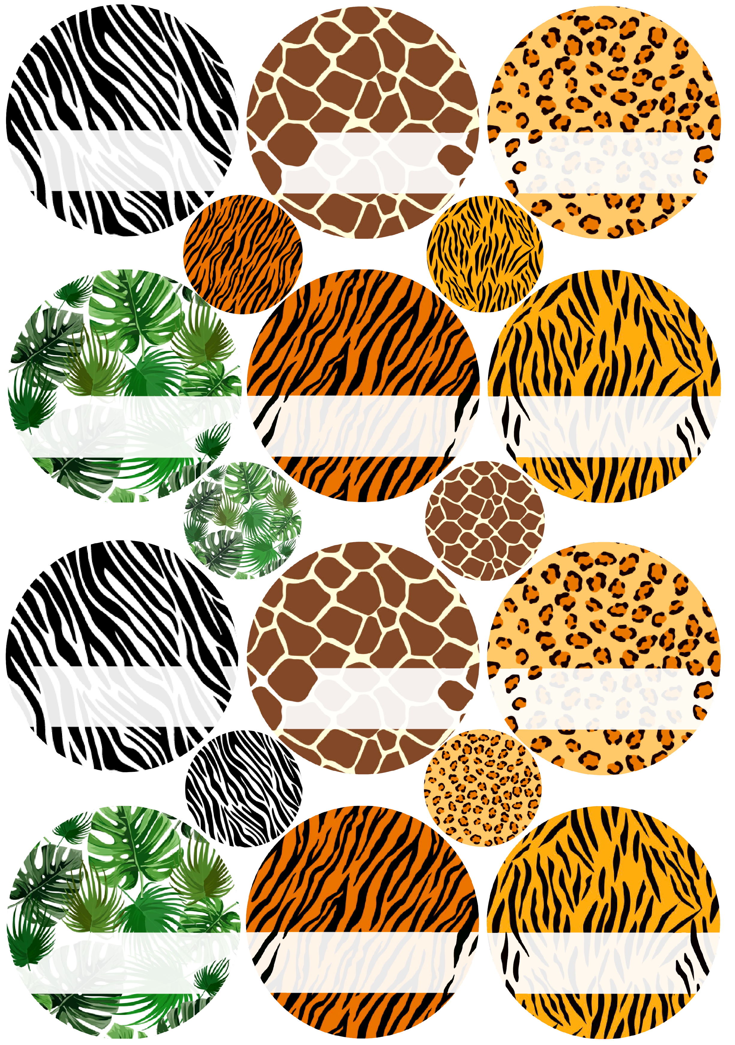 Safari mustritega kleebised, millel on valge osa nimede kirjutamiseks.