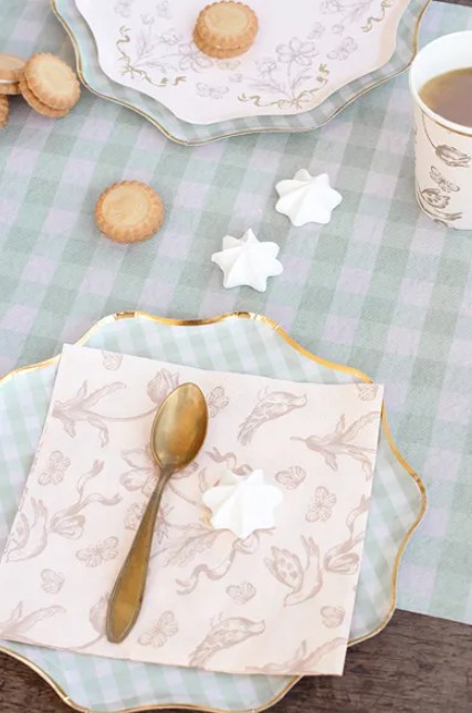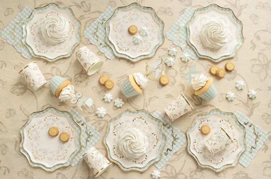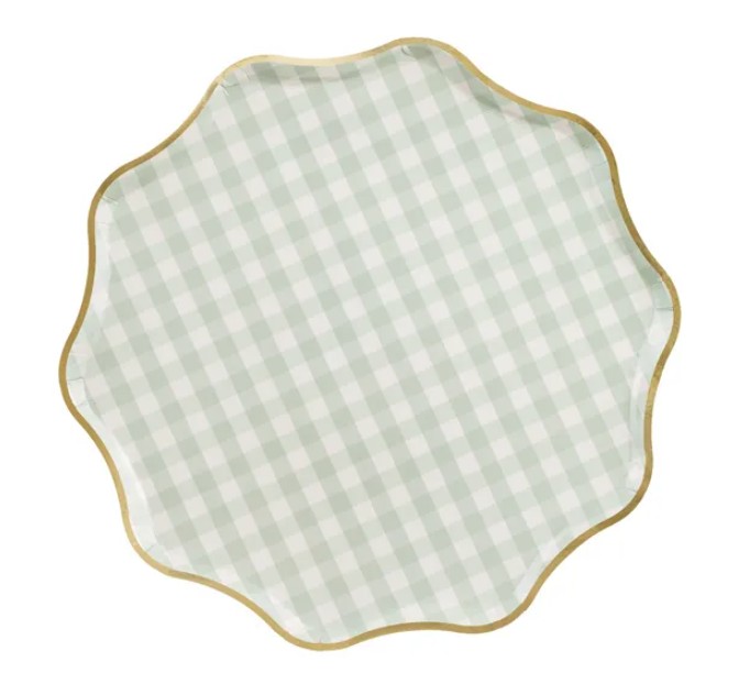 Kuldse äärega taldrikud, mis sobivad ideaalselt teemapeole või sõpradega ajaveetmiseks.