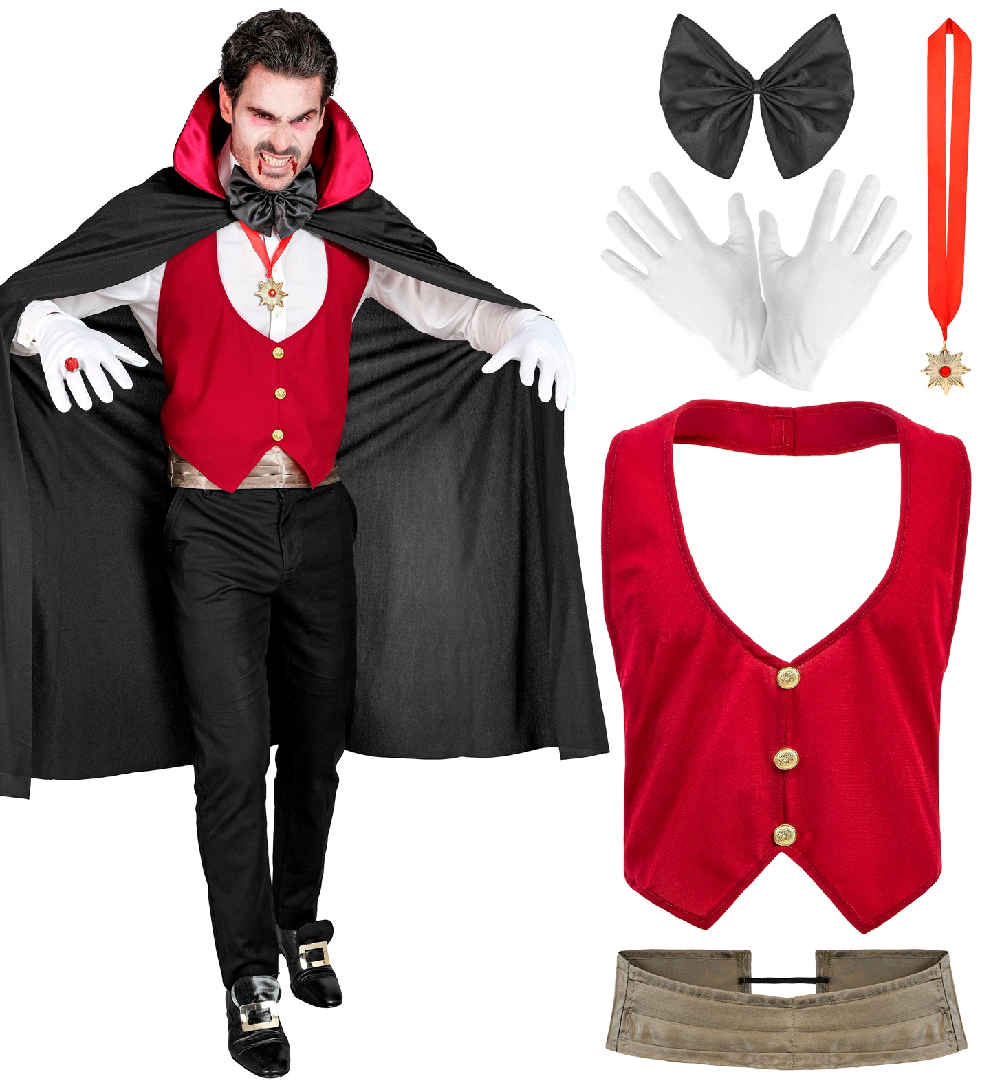 Vampiiri keep koos aksessuaaridega loob täieliku ja muljetavaldava välimuse: elegantne punane vest kuldsete nööpidega, pruun satiinist vöö, suur must lips kaelale, dekoratiivne medaljoniga kett, valged kindad ning must keep punase krae sisemusega ja kõrge, jäiga kraetõstega.
